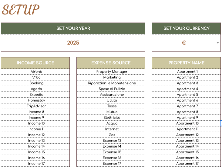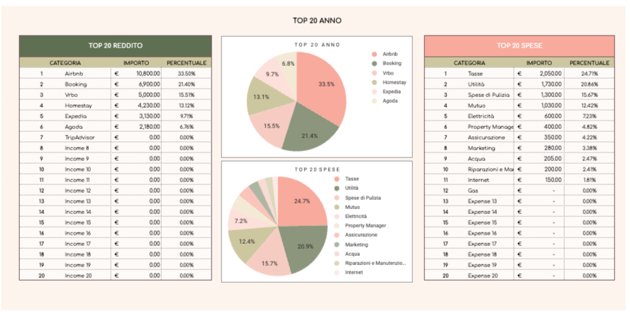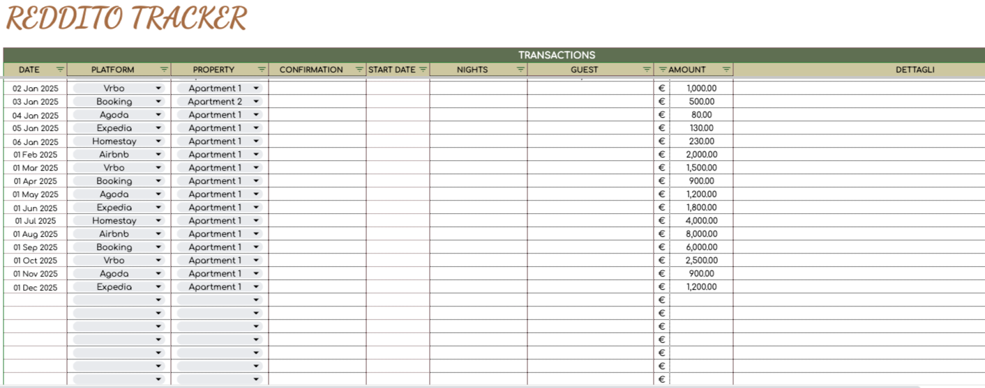 Ottimizza la tua gestione delle proprietà su piattaforme come Airbnb, Booking e VRBO, grazie al nostro tracker di fogli di calcolo Airbnb per gli host! Gestisci facilmente più proprietà e massimizza il tuo potenziale di guadagno.